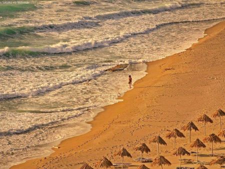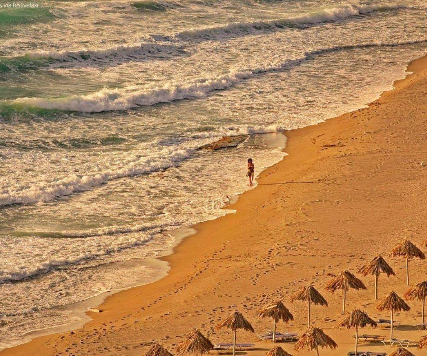 t is a lengthy stretch - over 2km long and up to 40m wide - of deep golden sand backed by natural dunes and cliffs topped with tamarisk trees, which is also a paradise for naturists and most likely will become an official naturist beach. At the southern end is the Komos taverna, a short walk away from the famous archaeological site. The lifeguard is to be found here, near the umbrellas and sunbeds, as well as toilets and a shower. Towards the northern end of the beach the sea bed is rock shelf, but at the taverna end it is sandy. The sand quality is good and the beach is very clean; if you enjoy snorkelling there are many fish to be seen.